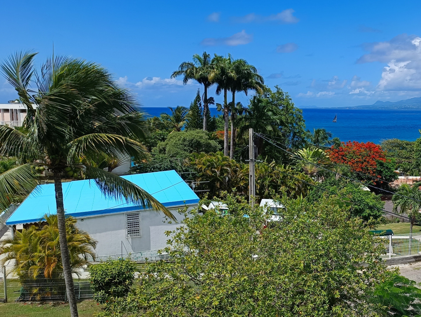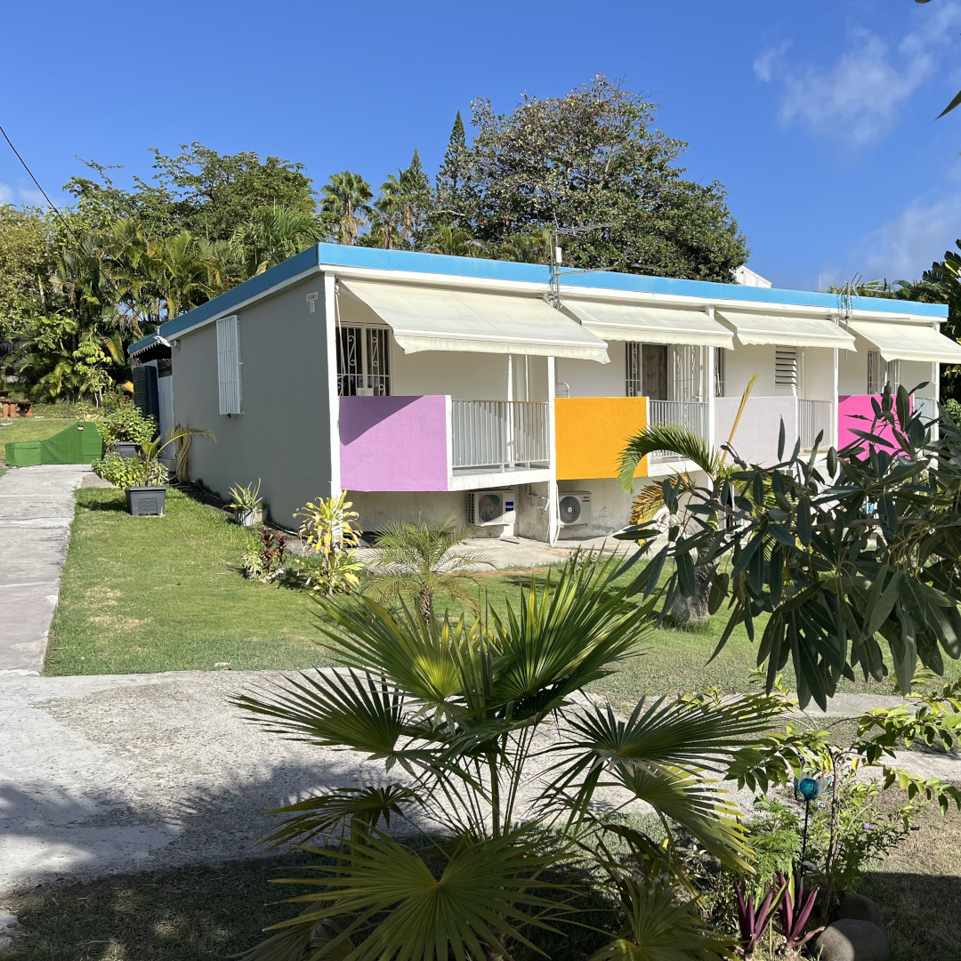 Sur un terrain d'une sperficie de 718 m², vous découvrirez l'immeuble IXORA, construit en 1975. Cet édifice comprend 4 studios de plain-pied (Click😉 A Parme, B Soleil, C Rose pâle, D Fuchsia). L’entrée de chaque studio se fait par la terrasse avant (est) qui donne accès à la kitchenette, la salle d'eau, la chambre climatisée et la porte-patio ouvre sur le balcon arrière (ouest).