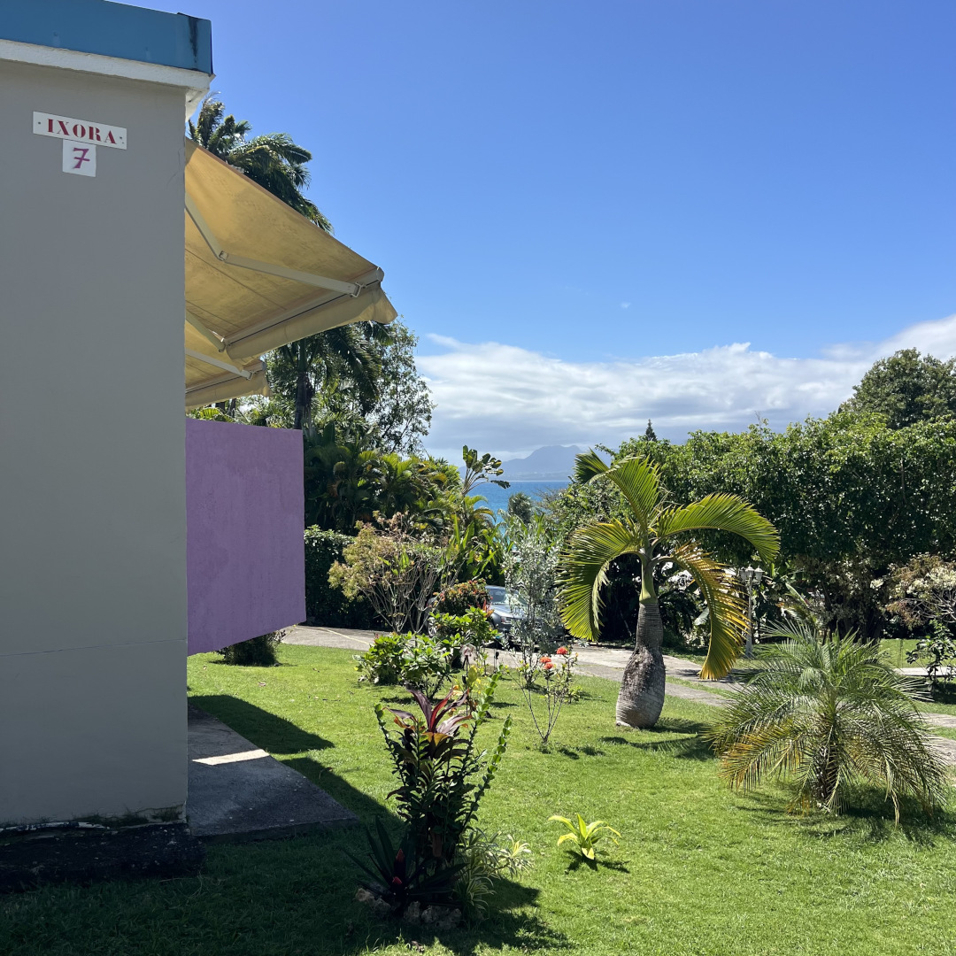 Sur un terrain d'une sperficie de 718 m², vous découvrirez l'immeuble IXORA, construit en 1975. Cet édifice comprend 4 studios de plain-pied (Click😉 A Parme, B Soleil, C Rose zouk , D Fuchsia). L’entrée de chaque studio se fait par la terrasse avant (est) qui donne accès à la kitchenette, la salle d'eau, la chambre climatisée et la porte-patio ouvre sur le balcon arrière (ouest).