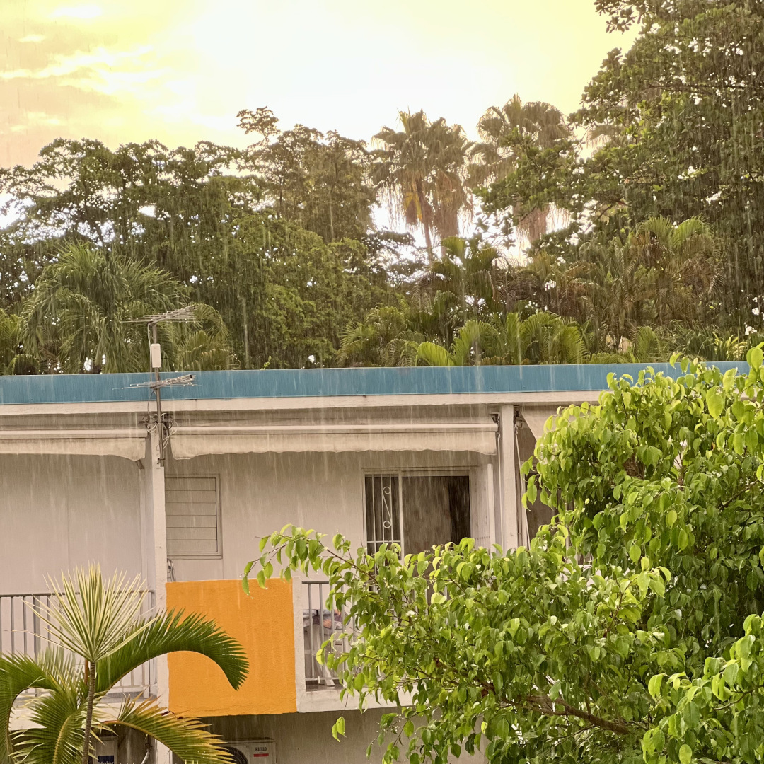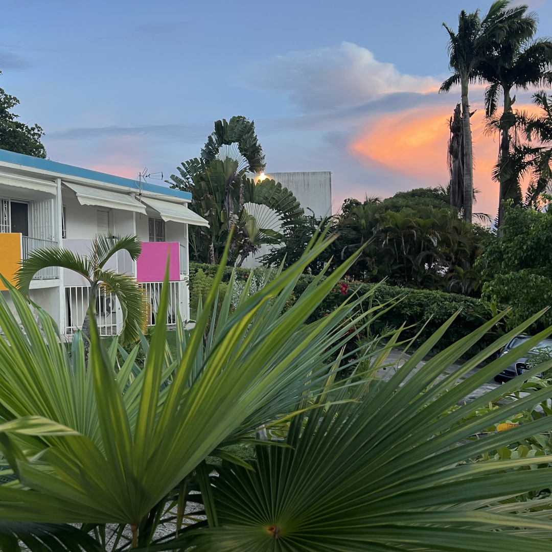 Sur un terrain d'une sperficie de 718 m², vous découvrirez l'immeuble IXORA, construit en 1975. Cet édifice comprend 4 studios de plain-pied (Click😉 A Parme, B Soleil, C Rose pâle, D Fuchsia). L’entrée de chaque studio se fait par la terrasse avant (est) qui donne accès à la kitchenette, la salle d'eau, la chambre climatisée et la porte-patio ouvre sur le balcon arrière (ouest).